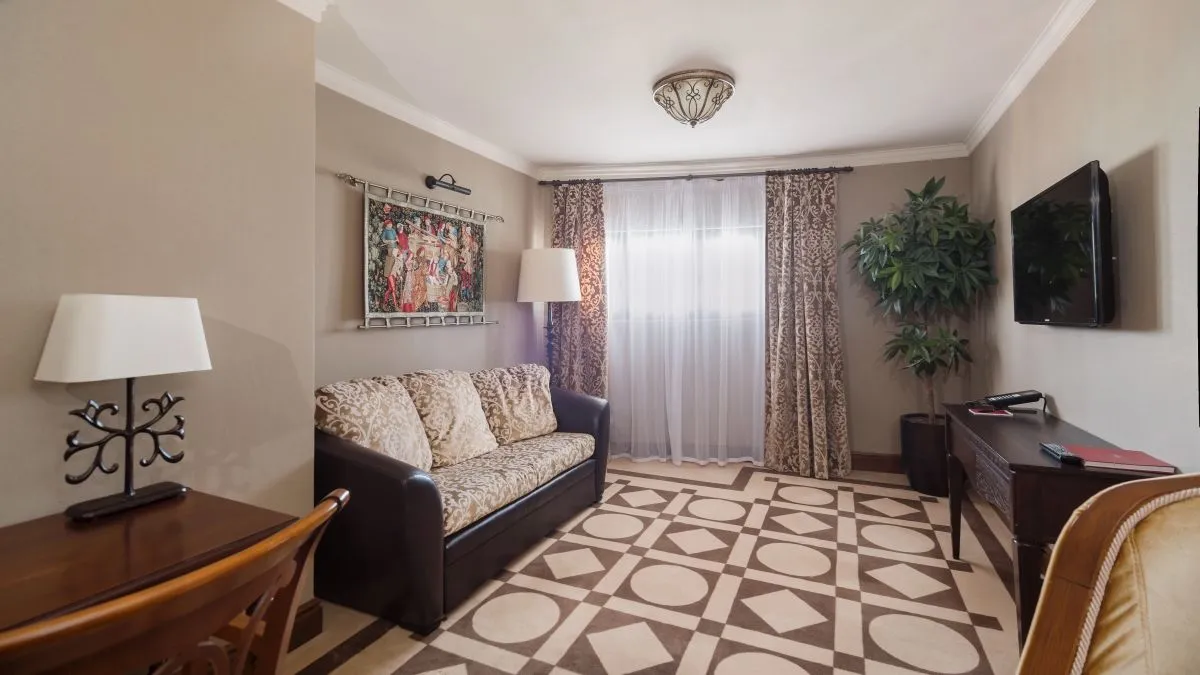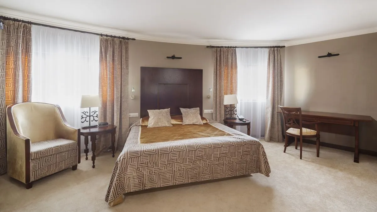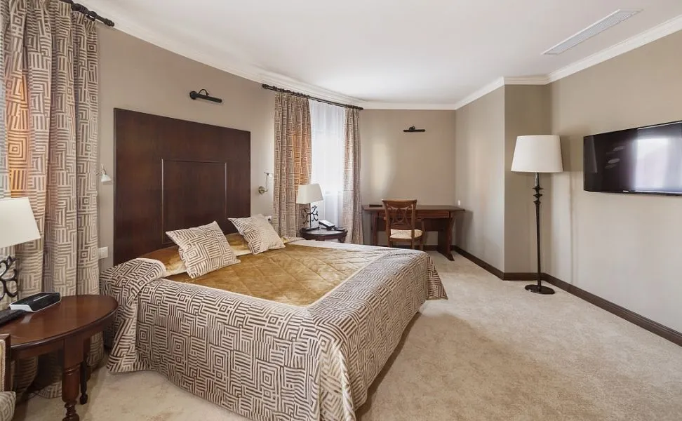 Просторный комфортабельный номер люкс площадью от 52,4 до 62,8 м2 с двумя комнатами (спальней и гостиной) и просторной гардеробной или шкафом. Интерьер люкса отличается сдержанностью и элегантностью, а цветовая гамма выдержана в благородных бежево-золотистых тонах. Одновременно в номере этой категории может проживать два человека, дополнительное место оплачивается отдельно.